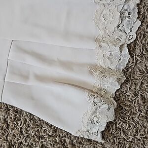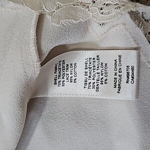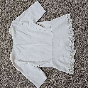 Rebecca Taylor top. Crepe lace inset blouse features exquisite lace details. V-neck cut with back zipper closure. Elbow-length sleeves with open lace details along length of sleeve. Pleated peplum like flow completed with scalloped lace hem. Ivory or off-white color. Women's size 10 (medium). 70% triacetate (semi-synthetic fiber), 30% polyester. Smoke free and pet free home. Please check out my other items...I'd love to make a discounted bundle for you. Thank you!!