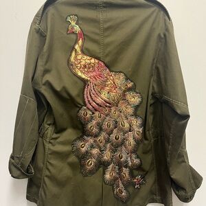 Furst Of A Kind upcycled Italian military jacket with sequined & embroidered Peacock at back.
