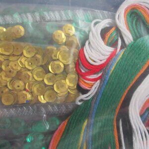"Jungle Bells" includes stamped felt for simple applique & embroidery, cotton embroidery floss, color separated sequins and beads, rickrack, needles, and easy to follow instructions. Stuffing not included.