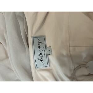 Perfect for weddings, parties and cocktail events, this dress is lined and comes in a beautiful beige color with strap and zipper accents. The designer dress is a size 4 and is ideal for women who want to make a lasting impression. Don't miss out on this one-of-a-kind piece that combines elegance and style in one.