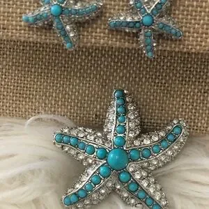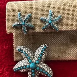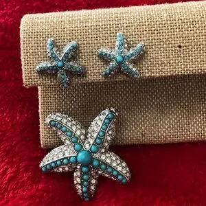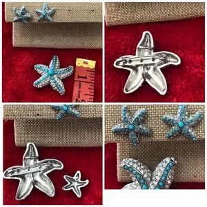 Gorgeous star earrings plus star pin. Strong blue stones adorned in silver shoes the true beauty of this earring pair plus pin. See photos for size and more details