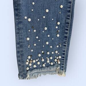 Cropped medium wash jeans with pear and rhinestone embellishments in the lower legs and frayed edges. Zipper and button closure, pockets and belt loops.