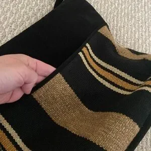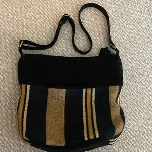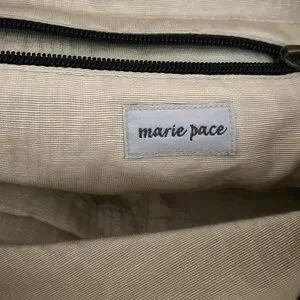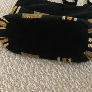 Outside is zip pocket on one side and open pocket on other side. Inside has one zipped pocket and 2 open. Tassels on both outside zippers.