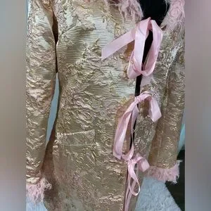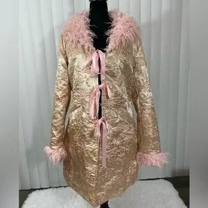 SUGAR THRILLZ High Class Heiress Brocade Coat Jacket Faux Fur Trim Beige Pink L