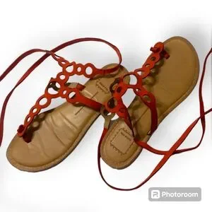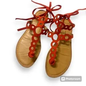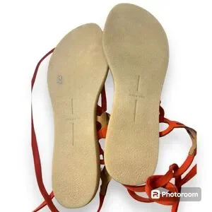 Never been worn, without tags. Women's Dolce Vita sandals Jolee style / Perin Style (not sure which exact style but has elements of both sandals) with long ties. Can be worn up the leg gladiator style or multiple wraps around ankle. Orange leather with tan heel.