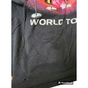 Get ready to rock and roll with this Stylistics World Tour T-Shirt! This black, size XL shirt features the iconic R&B music band on both sides, making it the perfect addition to any music memorabilia collection. Made in Mexico, this original piece is a must-have for any true fan of the industry. Whether you're wearing it to your next concert or keeping it on display, this shirt is sure to impress. Small hole, bottom right, as shown.