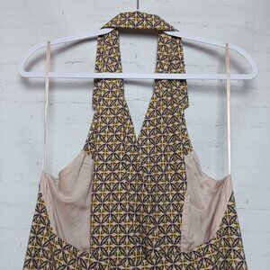 Cotton fabric with print shapes this chic dress with a halter neckline, front button closures, and a sleeveless bodice.