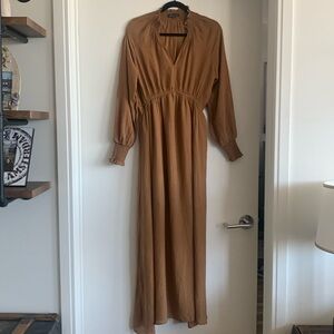 Boho chic maxi dress with elastic waistband. Flowy sleeves that are gathered at the wrist. V-neck with a ruffle around the back of the neck. Soft gauze-like material. Never been worn