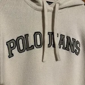 Vintage Polo Jeans Co. Ralph Lauren Sweater Hoodie in size large. In my opinion, this vintage piece runs small, and fits closer to a medium. Cream sweater with Polo Jeans logo embroidered on the front. Ribbed waist and wrists. Slightly cropped fit at the waist. Excellent condition.
