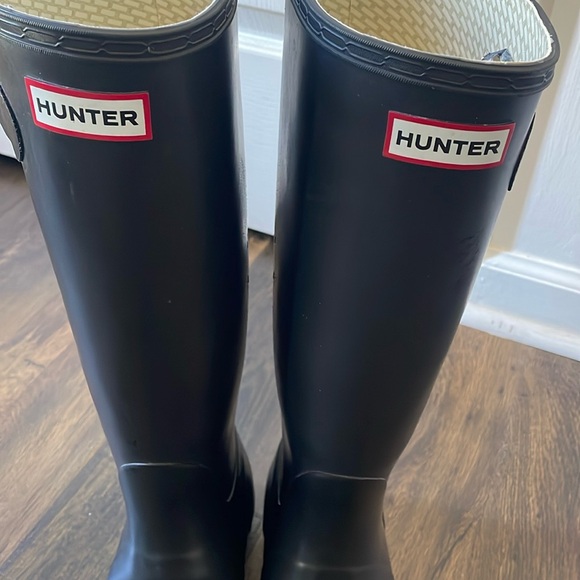 Authentic tall black chic round toe slip on traditional Hunter boots. Please see photos for smudges, thanks.