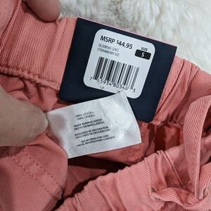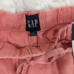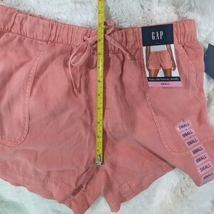 Pretty Gap pull-on Tencel drawstring shorts in "strawberry ice" color, 100% Lyocell material, elastic waist. Size small, measurements shown for waist, rise and inseam. Brand new, no flaws.