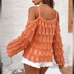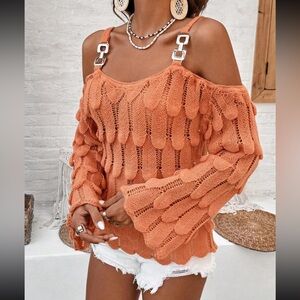 Cozy Boho Off Cold Shoulder Bell Flare Long Sleeve Pointelle Knit Sweater Top
