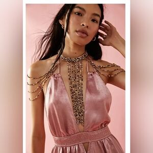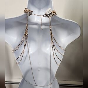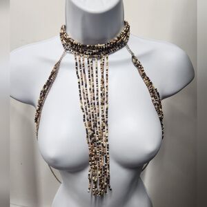 Bring the island vibes with this extravagant beaded body chain. *Features:* Beaded choker necklace, dangling beaded fringe, adjustable clasp closure behind neck, hanging chain armholes, beaded shoulder pieces*Why We <3 It:* Wear this with your favorite bikini top and denim shorts for the perfect statement piece to complete your festival look.