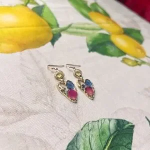 Gold dangle earrings feature pale yellow crystal glass bezels, colorful, floral resin heart pendants and French ball ear hooks.