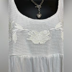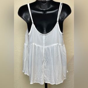 This is a very cute, white, boho, crochet halter tank top from Cotton On. It has thin adjustable spaghetti straps, crochet front inset, elasticized mocked back and flowy bottom.