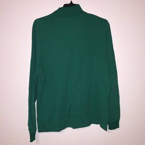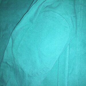Men's 3 button front pullover in green, long sleeve, ribbed cuffs with elbow patches