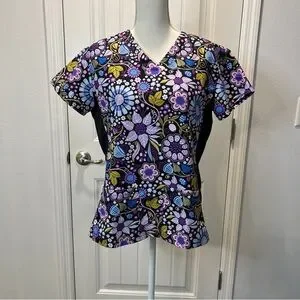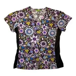 Green Town Scrub Top Purple Black Floral Size Small
