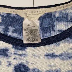 This Lucky Brand shirt has a tye-dye print with solid blocking on the shoulders and collar. Very soft with no flaws.