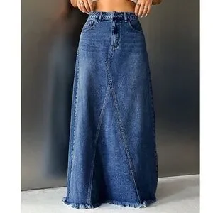 Boho medium wash Raw hem Jean Denim Pockets Maxi Skirt
