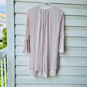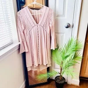 This Altar’d State dress is a stunning and elegant piece that effortlessly combines comfort with style. This dress offers a luxurious feel. It features a blush pink color with gold metallic stripes woven through the fabric, adding a touch of shimmer. Designed with long bell sleeves and buttoned front. Fully lined.