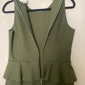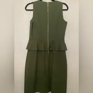 Kate Spade sleeveless, pre owned, olive green, peplum dress, straight hen cut, scoop neck, with gold tone zippered back closure, . Size 8, very versatile.