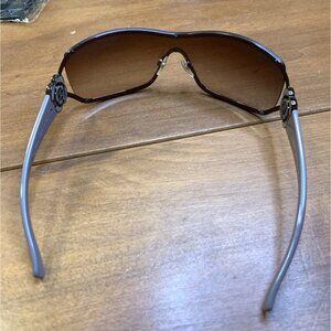 Pre-owned Chanel Bronze Tone/Brown Gradient 4164-B Camelia Shield Sunglasses with a pretty rhinestone pattern on the sides along with the original Chanel case. Glasses have a few scuffs on the lens as shown in the pictures but are still fully functional, these were bought at a retail store in Cincinnati several years back and have been well taken care of. The case has some wear as shown in the pictures and this sale also includes an unused Chanel cleaning cloth.