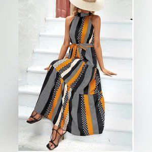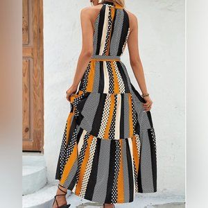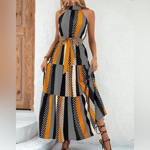 Halter Polka Dot Print Ruffle Hem Belted Dress