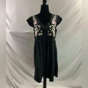 Black Floral Embroidery Butterfly Sleeve Smock Dress