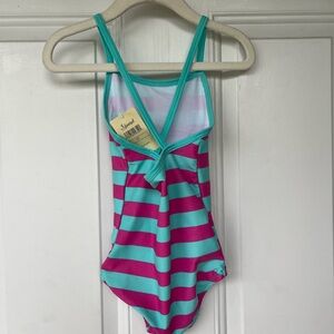 This is a cute, NWT one piece bathing suit from Leveret Toddler, size 3T. The fast drying fabric, 82% nylon/18% elastane, is striped in raspberry pink and pool blue, and is rated UPF 50+. Features straps that cross in the back. Machine wash and hang to dry for continual summer fun in the sun!