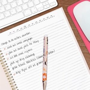 Pen is featured in a pretty floral design with a matching leatherette (vegan leather) pouch that snaps close to keep the pen secure in bags/purses as you travel
