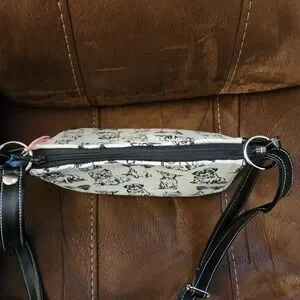 This handcrafted crossbody made with the cutest dog print has a single, adjustable strap that can be worn across your body to free up both hands or can be worn over one shoulder. Five inside pockets make it easy to find everything easily! One of the pockets is a large, zippered pocket. Two other sets of pockets make it easy to find items such as your keys or glasses fast! About 6" Tall, 10 1/2" Wide at Top, 8" Wide at Bottom, 4 1/2" Deep at Bottom