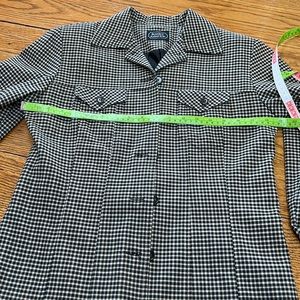 Bentley Arbuckle vintage checked jacket. Fully lined. Classic checked pattern in brown, black and cream. Made in USA. Peplum details in back. Button front with small lapels and thin shoulder pads. No size tag but approximately 10-12. (I wear a 14 and it felt a bit snug on me). I added measurements in photos. Excellent condition, classic vintage style.#MKL105/04/23SFM