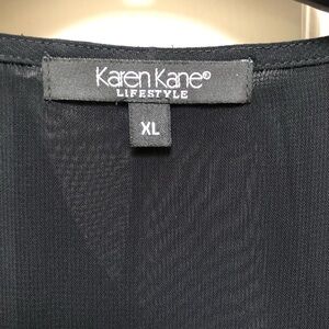 Sheer rayon or poly blouse with ruffled collar, front and cuffs. Karen Kane-XL. Hook and eye closure. Semi fitted with flattering darts on front and back. Small hole on back left side. Can be dressed up or down easily.
