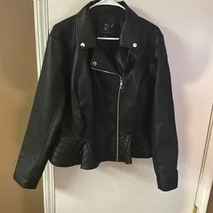 Never worn black moto jacket. Has ruffles around the waste with silver accent buttons. Jacket zips in the front. Lightweight jackets