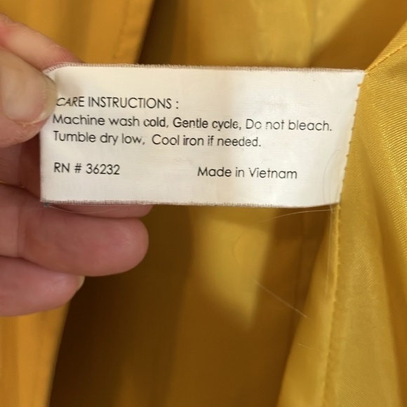 This yellow raincoat is belted and has a detachable hood that also can cinch tighter around your face. It has a zip plus snap enclosure. Extra neck tab and snap closure to keep out the wind. The coat is fully lined with polyester fabric. It is a very nice weight coat. On the dressier side rather than utilitarian. Button cuffs. Nice silver accents for snaps & belt loops. I wore it without the belt and it looked great. Tie belt included. Excellent preloved condition in a size large. Not oversized. See pics for measurements. Two side pockets.