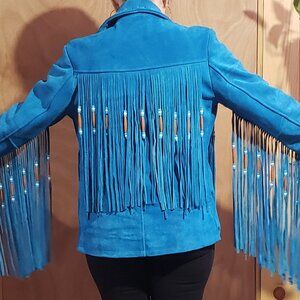 Beautiful, brand new, never been worn only for picture! If you love the 70's styles, the fringe & the cool fun then this is your jacket. It's a size medium but I would guess it is about a size 7. It's very well constructed, lined with one inner pocket. It is just the coolest fringed jacket ever! Looks great with jeans or even a skirt...short mini or long, you choose. It's a great spring, fall or even early winter jacket. I've seen jackets like this going for $600, so it's a steal at this price. In the picture close up to show the tag that says leather, it appears the jacket is faded or has color loss. That is a photo issue. This jacket has solid color blue throughout the jacket so photo is flawed.