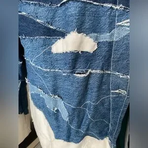 Handmade denim patchwork jacket. Unique design. Silk lining. Not some small holes in the denim patchwork but adds to the effect. Size small
