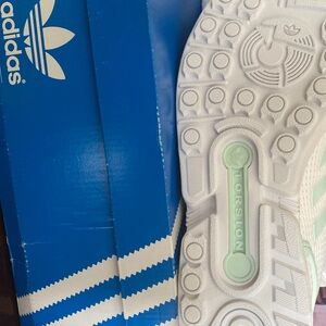 Ladies, Adidas, tennis shoes new in the box white with an accent of seafoam green