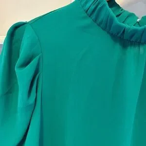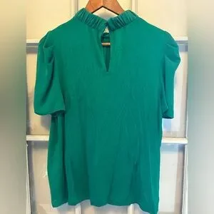 Cap sleeves, ruched mock neck. Back has button closure with keyhole cut out.