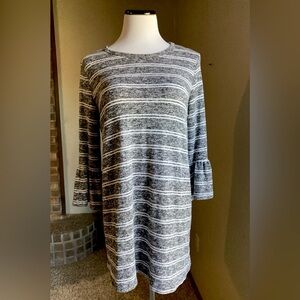 Lightweight Grey with White Striped Oversized Long Sleeve Top with Ruffled Sleeve Size Medium. 85% polyester 12% Rayon 3% spandex