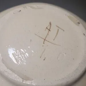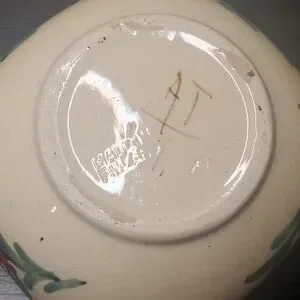 Vintage Finland Signed Floral Hand Painted Square Stoneware Bowl with Painted Green and Yellow Rings in Center