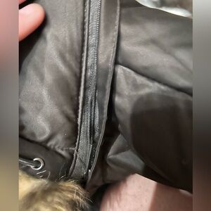 Brown Calvin Klein winter jacket. Detachable hood. Fur on hood. Fleece inside jacket. Has inside pocket. Has a zipper pocket on arm.