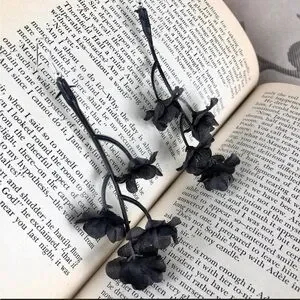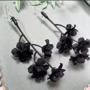 Your beauty is beyond compare, Joleneš¶ These black flower bundle earrings are dark, captivating, and feminine! Faux flower stems, attached to silver hypoallergenic earring hooks. These are about 4 inches long when worn, and arenāt itchy or scratchy. Named after the inimitable Dolly Parton song! Each faux flower is slightly different even when from the same stem, so please understand small differences in color or petal/leaf layout. Great for any season, parties, decorating work outfits, Halloween, jamming out, disneybounding or cosplay, and on-the-go!