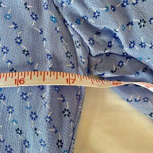 Ganni blue with dainty flower print high neck ruffle mini dress, size 36 EU/6 US. Clasp and bow at collar, long sleeves, elastic waist, lined skirt, sheer top, pockets. Excellent used condition. Bust measures 17.25 inches laying flat, waist is 16 inches, dress length is 33.75 inches. Cat friendly, nonsmoking home.