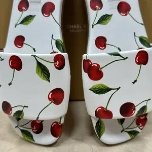 RUNWAY COLLECTION WHITE CHERRY PRINT FLAT LEATHER SLIDES MADE IN ITALY 🇮🇹