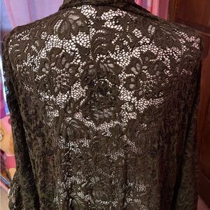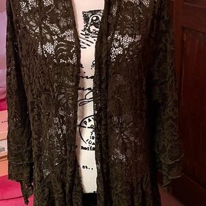 This is a dark olive green lace boho jacket size 1x. Gives the Stevie Nicks vibe. Great condition only worn 3 times.