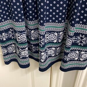 Sleeveless Polyester/spandex fun dress for the office or casual outing. Blue, white, green print. Flattering for women.