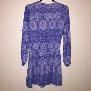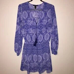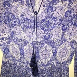 Long sleeve blue and white peasant dress. Lined skirt, light elastic in sleeves and waist. V-neck embellished with blue tassels. Lightweight fabric, gently worn, great condition.