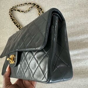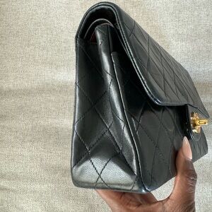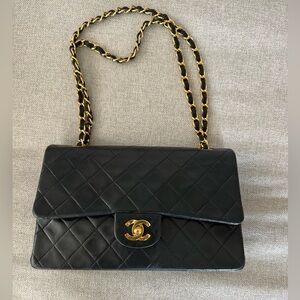 This is an authentic CHANEL Lambskin Quilted Medium Double Flap in Black. This chic shoulder bag is crafted of diamond quilted lambskin leather in black. The bag features a rear flat pocket, a leather threaded gold chain link shoulder strap, and a matching gold CC turn lock on the front flap. This opens the bag to an inner flap and smooth leather interior with patch pockets