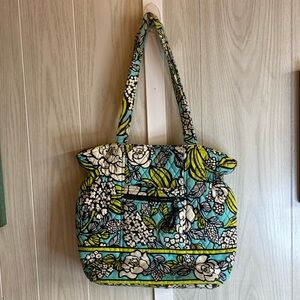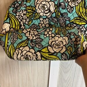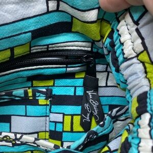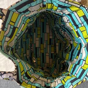 Vintage teal black and lime green print purse. Multiple pockets inside with outer zipper and pocket to front.